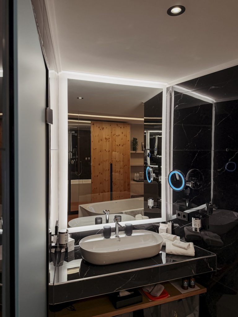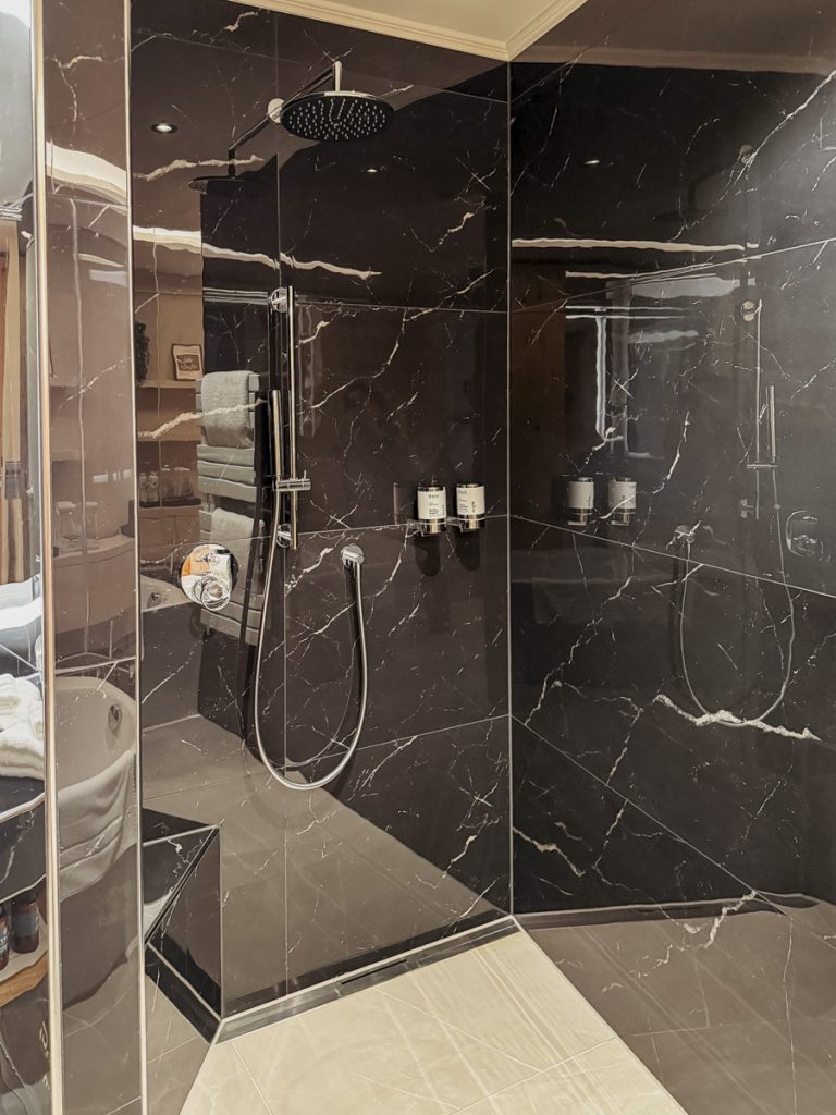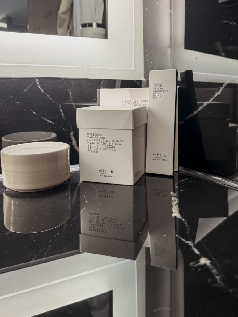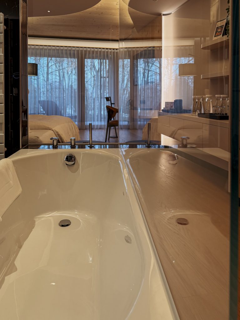 Wir beziehen ein Deluxe Doppelzimmer – 42 Quadratmeter, Balkon in Südlage, freistehende Badewanne mit Blick auf den Bodensee. Der Blick trifft uns ein bisschen unvorbereitet – so direkt, so ruhig. Was uns Hans-Jürg Buff im Gespräch verrät: Jedes Zimmer im Haus, ganz unabhängig von der Kategorie, schaut nach Süden. „Mir war es wichtig, dass alle Gäste die gleiche Ruhe und die gleiche Aussicht haben“, erklärt er. Dass sich das auch preislich niederschlägt, liegt auf der Hand – aber das Prinzip dahinter hat Substanz.