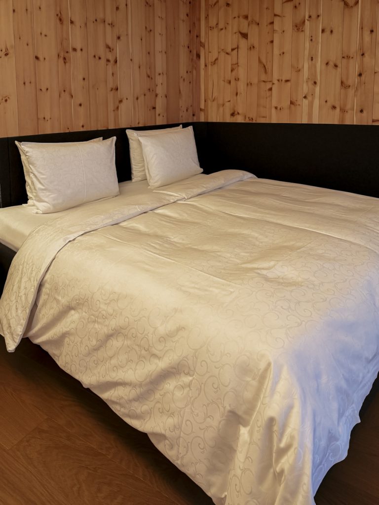 Das Bett ist, laut Hans-Jürg Buff, tatsächlich einzigartig: kein Metall, keine Federkerne, keine Metallschrauben – das gesamte Bett besteht aus reinem Naturholz. Der Hintergedanke: Metallstrukturen wirken wie Antennen für elektromagnetische Felder. Am Kopfende gibt es keine Steckdosen mit Hochspannung, keine Ladeinfrastruktur für Handys. Das Handy lädt man hier also ohnehin nicht neben dem Bett auf – und wer jetzt denkt, das sei ein Problem, dem sei gesagt: wir haben so gut geschlafen wie lange nicht.
