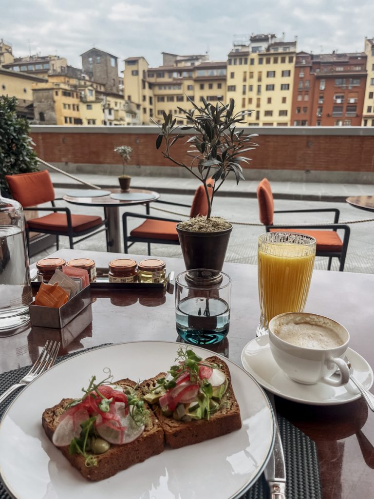 Am nächsten Morgen kehre ich für das Frühstück zurück, diesmal im Außenbereich auf der Terrasse. Frischer Cappuccino, warme Cornetti, Eierspeisen und Avocadobrote à la Carte: ein klassischer italienischer Start in den Tag, bevor ich mich wieder in den Trubel von Florenz begebe.