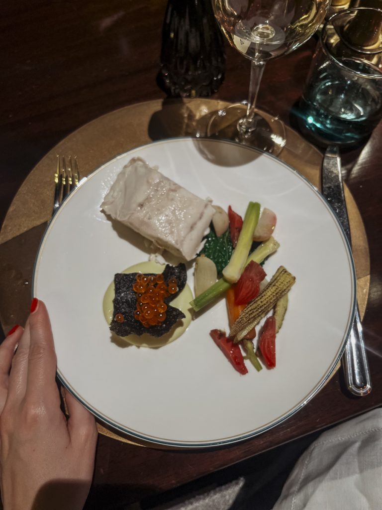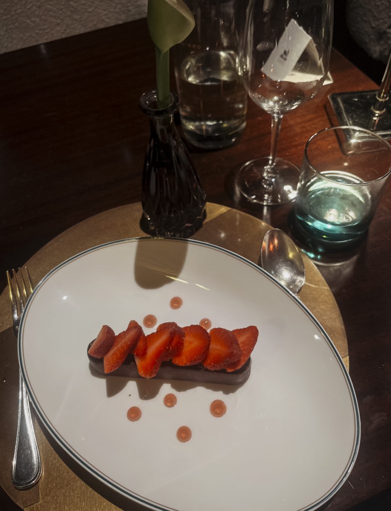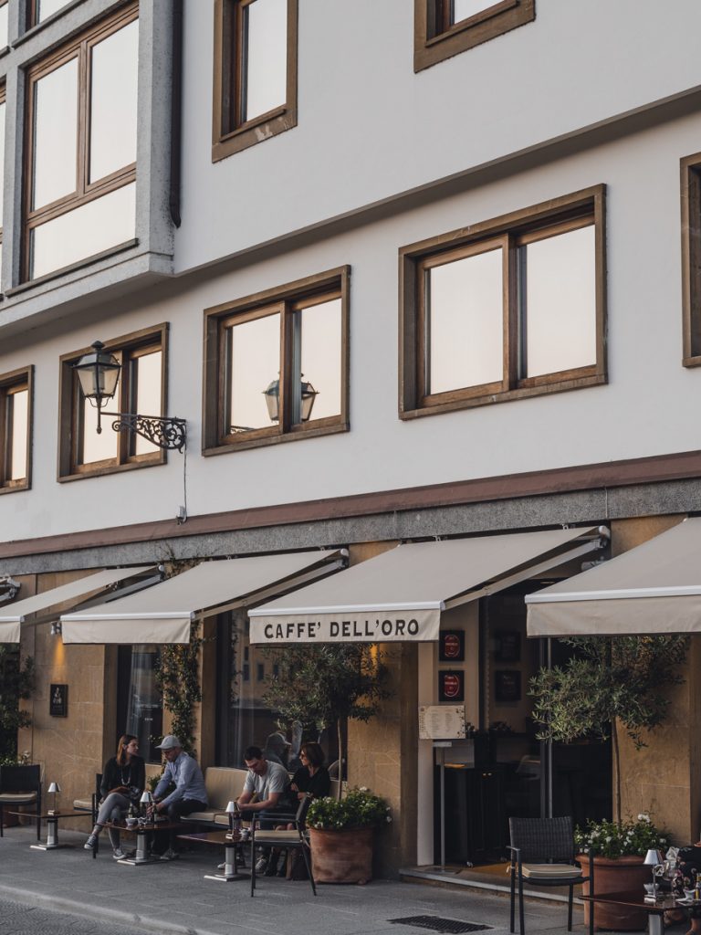 Am Abend zieht es mich in das Restaurant des Hotels, das Caffè dell'Oro. Direkt am Arno gelegen, gehört es zu den schönsten Dinner-Spots der Stadt. Die Terrasse liegt nur wenige Meter vom Wasser entfernt, und während ich Platz nehme, färbt die untergehende Sonne die Fassaden rund um die Ponte Vecchio in warme Goldtöne. Die Atmosphäre ist stilvoll, aber entspannt – genau das, was man sich von einem Abend in Florenz erhofft. Vor dem Essen bringt mir Restaurantleiterin Maria einen Aperitivo: einen klassischen Negroni, der hier natürlich besonders gut schmeckt, schließlich wurde er nur wenige Straßen weiter in der Stadt erfunden. Die Küche ist modern italienisch mit regionalen Einflüssen. Sie empfiehlt mir als Antipasto die für Florenz eher ungewöhnlichen Tacos mit Guacamole und rohen Garnelen. Natürlich gibt es als Hauptspeise klassische Pastagerichte wie Spaghetti mit toskanischen Tomaten oder Fusilli in Parmesansauce, die Restaurantleiterin bringt mir jedoch ihr Lieblingsgericht: den Branzino al Vapore. Es schmeckt so unglaublich, wie nur Italiens melodische Aussprache sein kann. Gegrillte Seebrasse auf schwarzen Algenchips mit einer leicht scharfen Wasabi-Mayonnaise-Creme und Lachskaviar. Einfach bellissimo. Dazu frisches Gemüse aus der Region und ein kühles Glas Vermentino. Maria trifft meinen Geschmack so gut, dass ich sie auch mein Dessert auswählen lasse. Das gefrorene Schokotörtchen mit frischen Erdbeeren wird wie selbstverständlich zum perfekten Abschluss des Menüs.