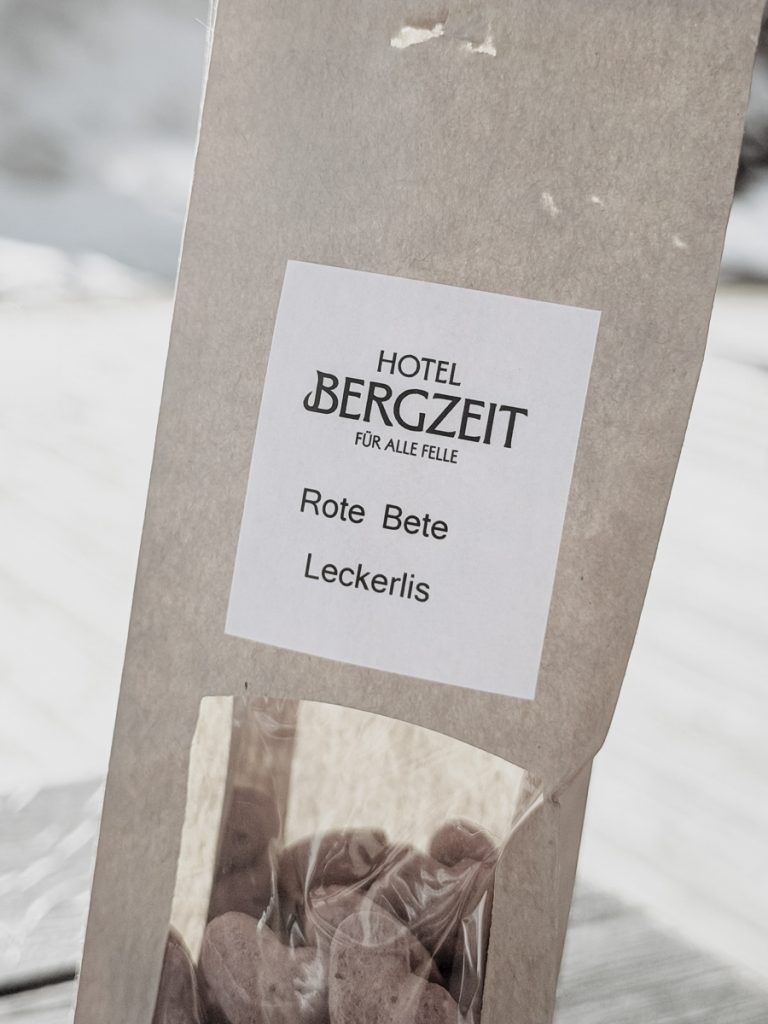 Der fix zugeteilte Tisch im Restaurant gibt Qalisha Orientierung – sie hat schon Platz genommen, bevor ich die Speisekarte aufgeschlagen habe. Wir schmökern in der „Bergzeit-ung“ – und entdecken darin das Rezept für Hundekuchen. Diesen hat Qalisha bereits im Foyer am originellen Hunde-Buffet erschnüffelt und für gut befunden hat. Die Ausflugstipps und die Wetterprognose locken uns anschließend nach draußen.