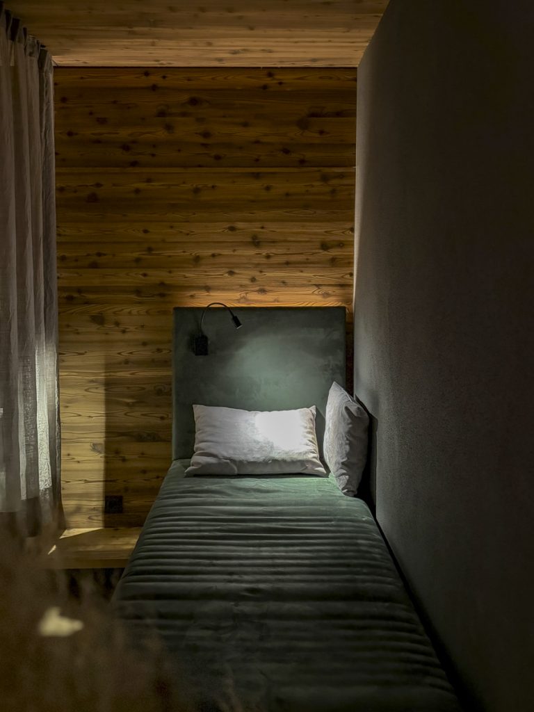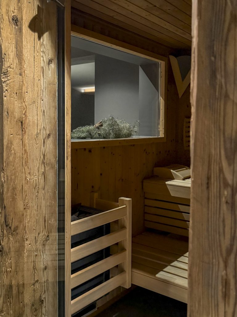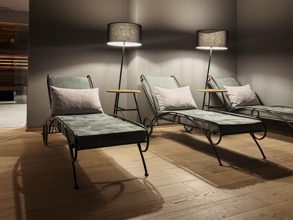 Der SPA-Bereich liegt gleich nebenan, gestaltet in einem ruhigen, stimmigen Farbkonzept: Warme Salbeitöne, sanfte Lichtstimmung, einladende Ruhekojen – ein echter Rückzugsort nach einem Aufguss in der Sauna. Meine zweite Begleitung gönnt sich hier nach einem Abstecher in den angrenzenden Fitnessraum genau das: Stille und ein gutes Buch.