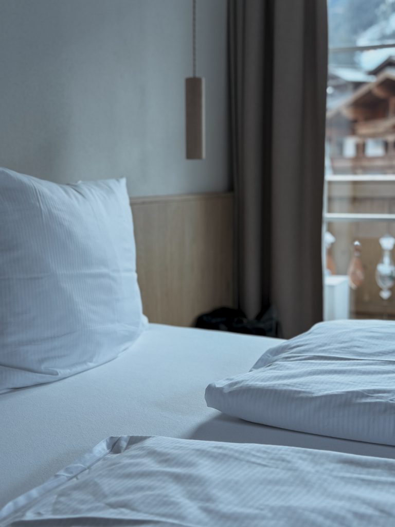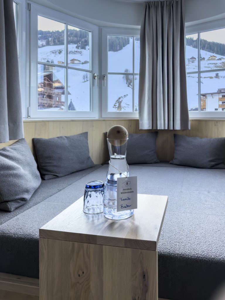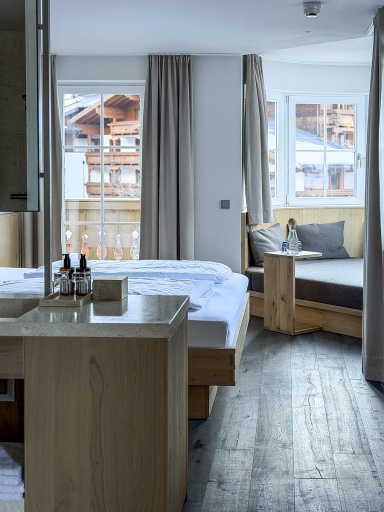 Unser Zimmer ist ein Panoramazimmer mit großem Morgensonnebalkon – der Blick geht über den Ort hinein in die Berge. Die Ausstattung ist funktionell, aus heimischem Holz und hochwertigen Naturmaterialien gefertigt. Die Lümmelecke im Erker ist mit feinem Loden einer heimischen Manufaktur gepolstert, das zum Zimmer offene Bad lässt alles weit und hell wirken.