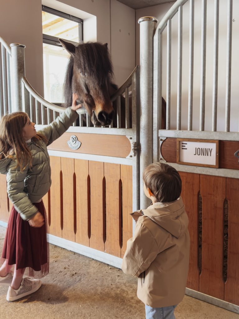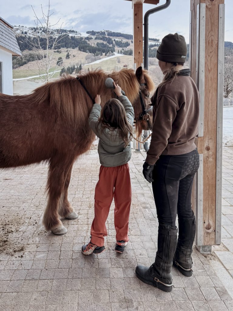 Wer den Ellmauhof als Skihotel mit netter Beigabe bucht, versteht nicht, was hier wirklich gebaut wurde. Die Reitakademie ist neu, professionell geführt und in einer Liga, die man in einem Familienresort nicht voraussetzt: Panoramareithalle, Longierhalle, gepflegter Außenreitplatz. Die Anlage ist sauber, die Tiere sind in offensichtlich gutem Zustand. Haflinger, Isländer und Shetlandponys – ich lerne die Namen schnell: Pocahontas, Seimur, Jonny, Lilith, Flikka, Strike. Direkt angrenzend: der Streichelzoo mit Ziegen, Schafen, Hasen und Meerschweinchen, und der Mini-Bauernhof mit den Miniponys Collins, Cindy und Shelly – sowie einer aktiven Haflingerzucht, die das Haus selbst betreibt.