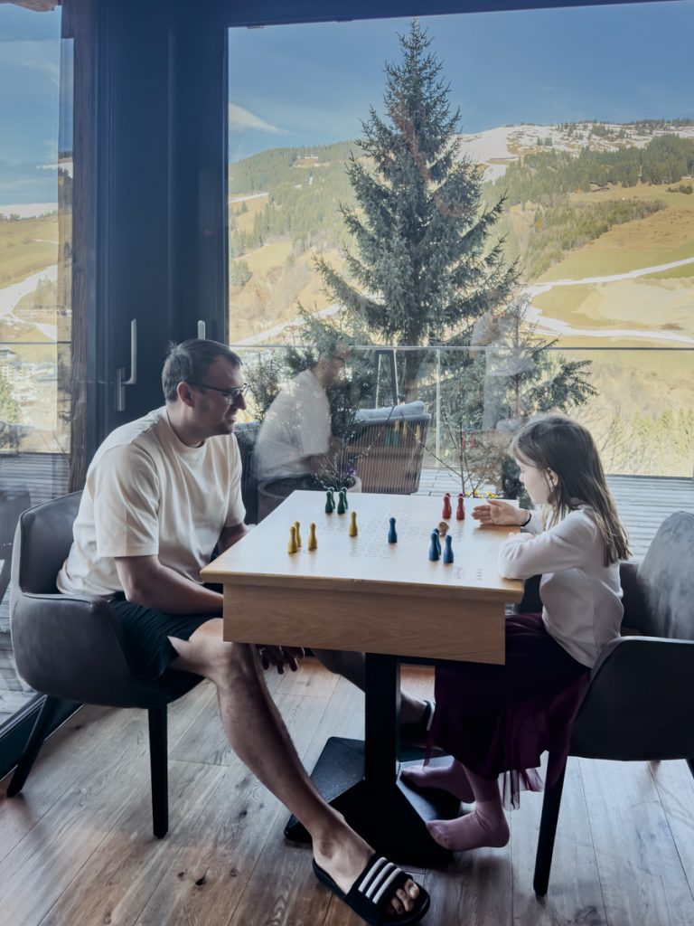 Schon am ersten Morgen verstehe ich, warum dieses Detail auf so vielen Familienhotels groß beworben wird – und wie selten es wirklich konsequent umgesetzt ist. Hier stimmt es. Der Skiraum liegt keine dreißig Schritte vom Lift entfernt, der Lift direkt neben dem Resort. Kein Transfer, kein Zeitdruck. Lina und Philipp finden ihren Morgenrhythmus nach dem zweiten Frühstück: Helm, Ski, raus. Fertig.