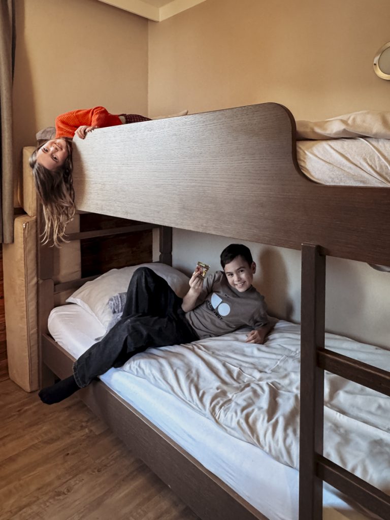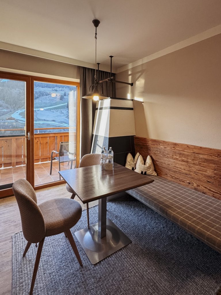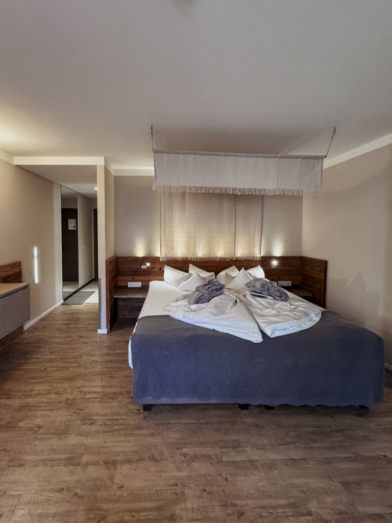 Das Zimmer gefällt schon beim Betreten. Die Familiensuite ist deutlich großzügiger als erwartet – und das bemerke ich nicht nur beim Eintreten, sondern drei Tage später, wenn ich feststelle, dass wir uns nie auf den Füßen stehen. Fichtenholz, warme Töne, eine separate Sitzecke, die abends zu Rummy-Cup-Runden einlädt. Das Bad ist mehr als groß.