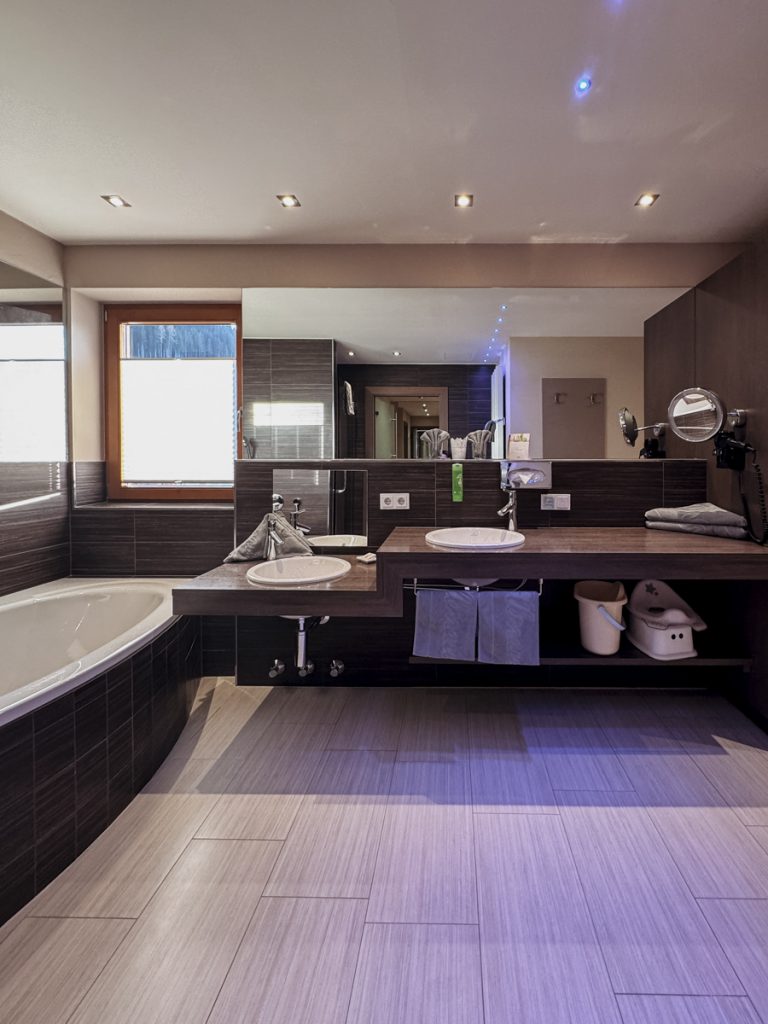 Das Erlebnishallenbad mit 52 m Tunnelrutsche, beheiztem Pool, Kleinkinder-Wasserwelt und Saunalandschaft ist strukturell ein ernstes Argument – 1.500 m² Wellnessbereich, warm, großzügig, gut angelegt. In der Praxis des Aufenthaltes: fast kein Thema. Nach dem Skifahren zieht es Lina und Philipp jedes Mal direkt zum Stall oder in den Spielstodl. An einem verregneten Tag in der Sommersaison wird die Wasserwelt vermutlich zum Mittelpunkt – im März mit unseren zwei Kindern war sie das nicht. Während die Kinder den Reitstall unsicher machen, gönnen wir uns etwas gemeinsame Paarzeit im Spa – sehr schön!